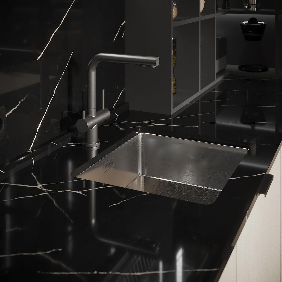 • Красивая кухня с золотыми акцентами в двухкомнатной квартире бизнес-класса