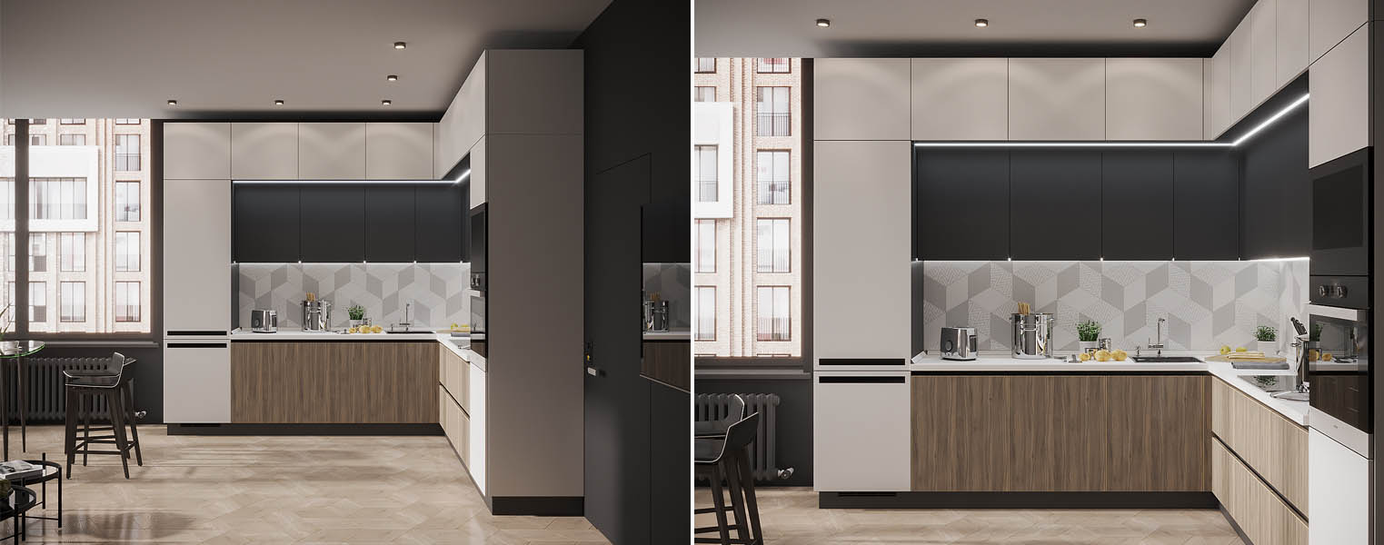 • Красивая кухня с золотыми акцентами в двухкомнатной квартире бизнес-класса
