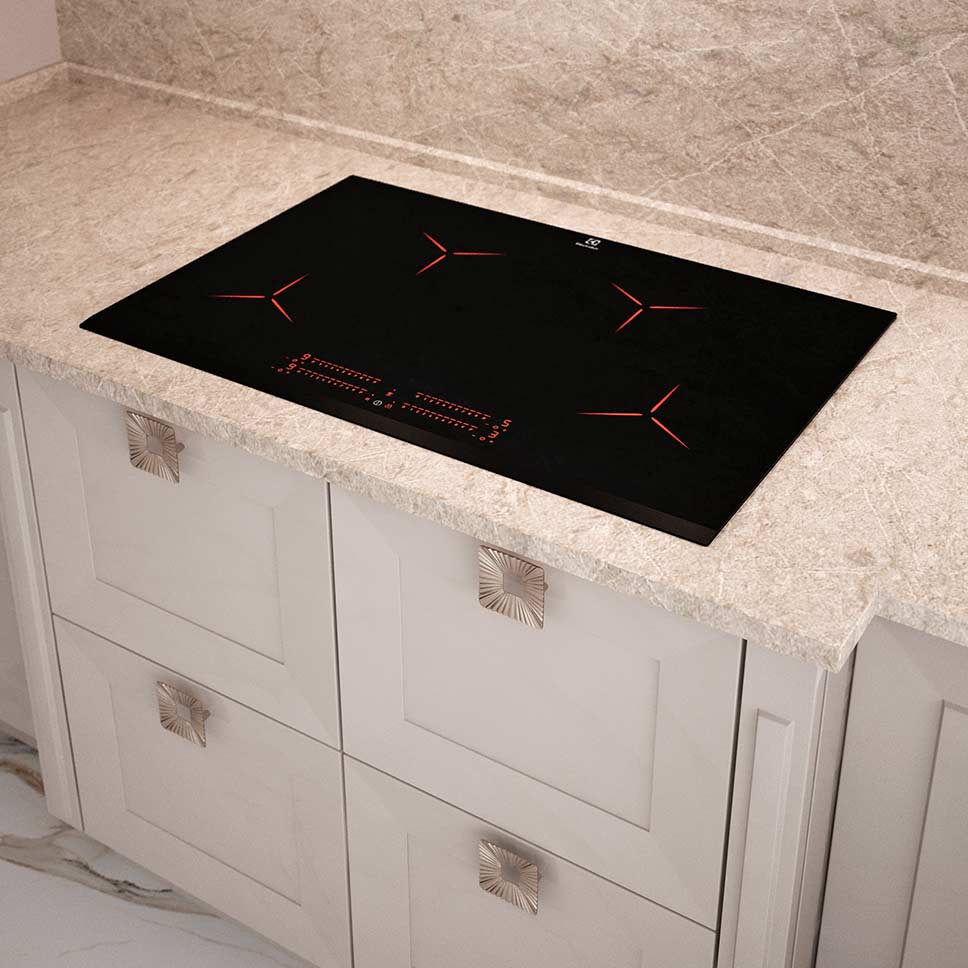 • Красивая кухня с золотыми акцентами в двухкомнатной квартире бизнес-класса