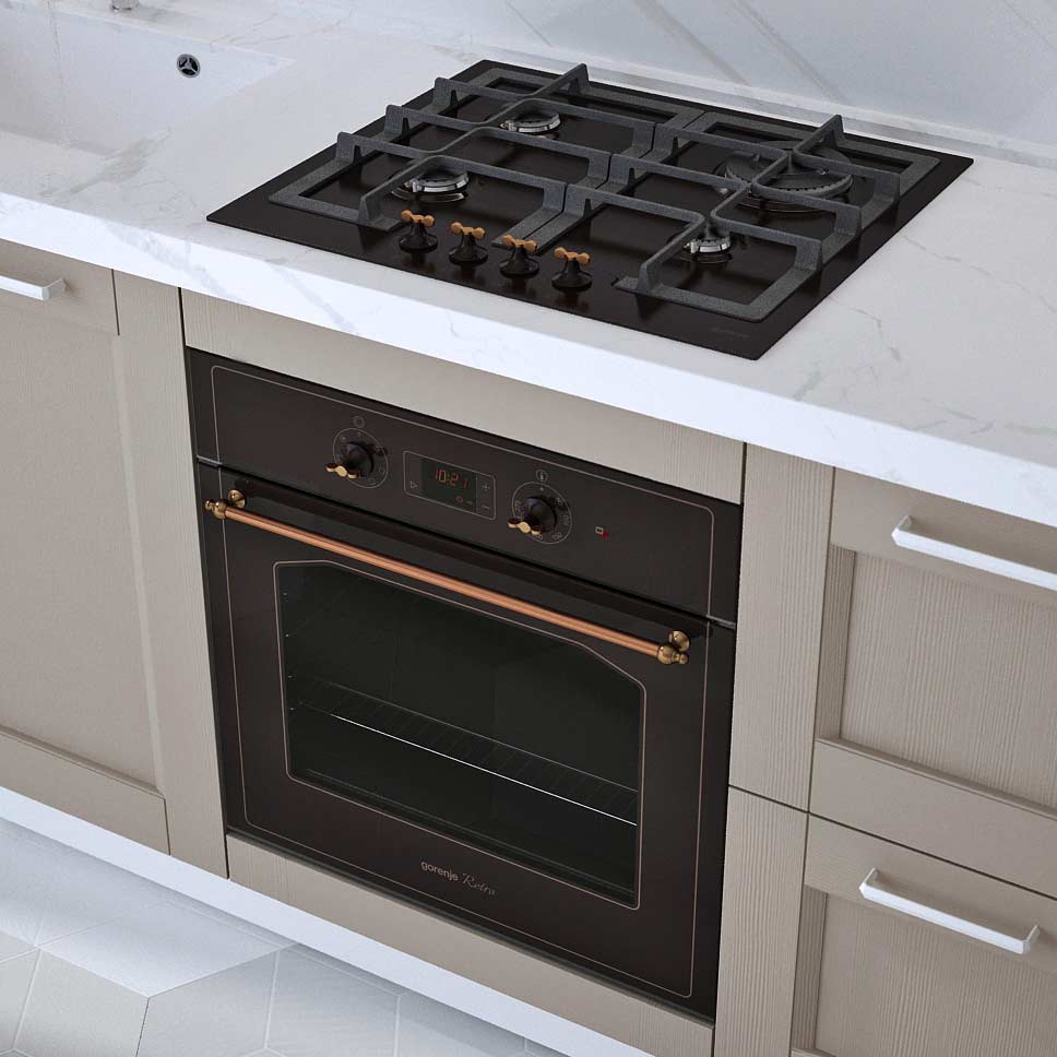 • Красивая кухня с золотыми акцентами в двухкомнатной квартире бизнес-класса