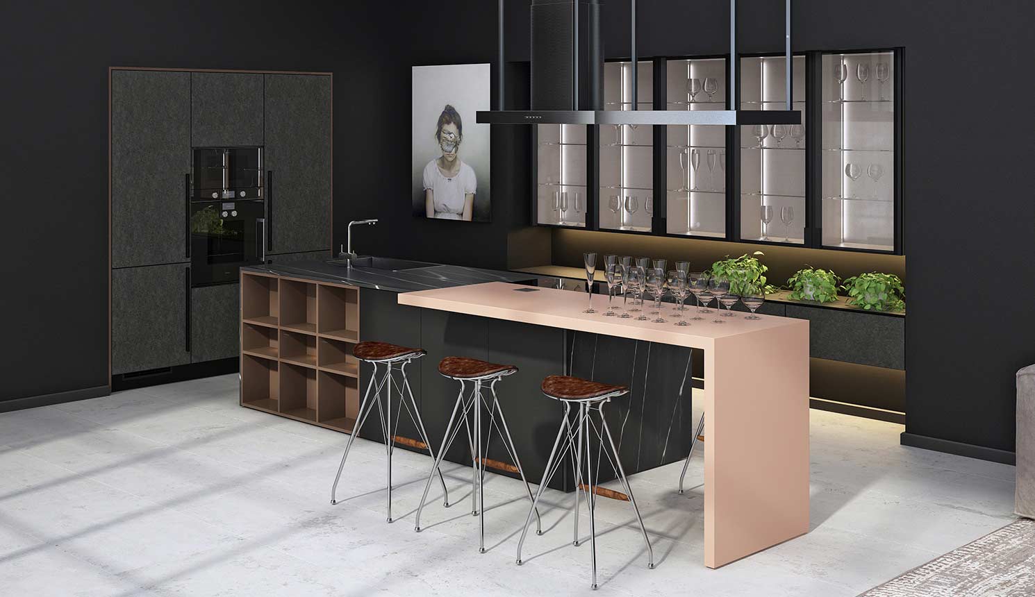 • Красивая кухня с золотыми акцентами в двухкомнатной квартире бизнес-класса