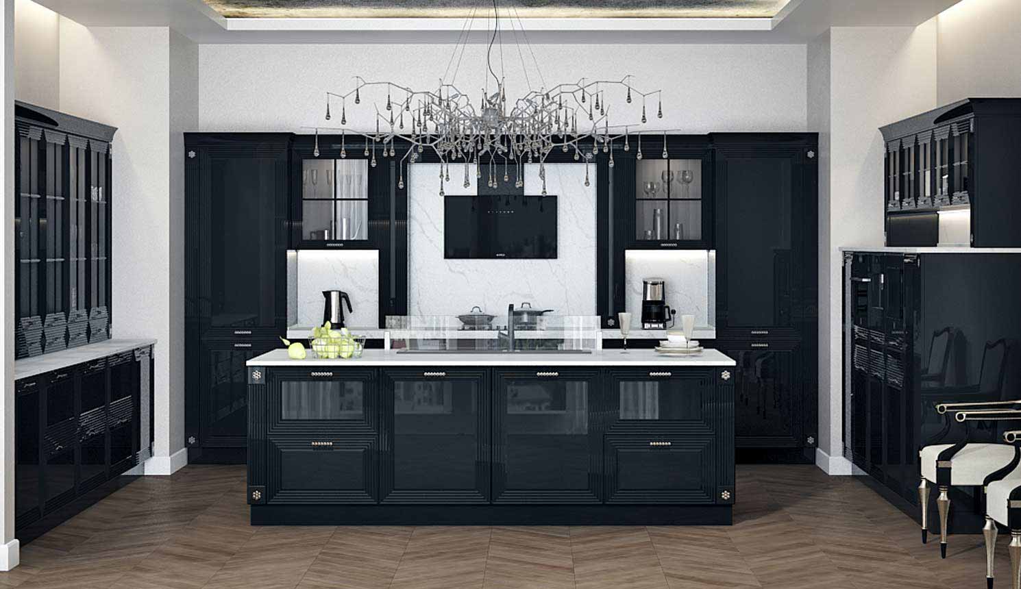 Красивая кухня с золотыми акцентами в двухкомнатной квартире бизнес-класса