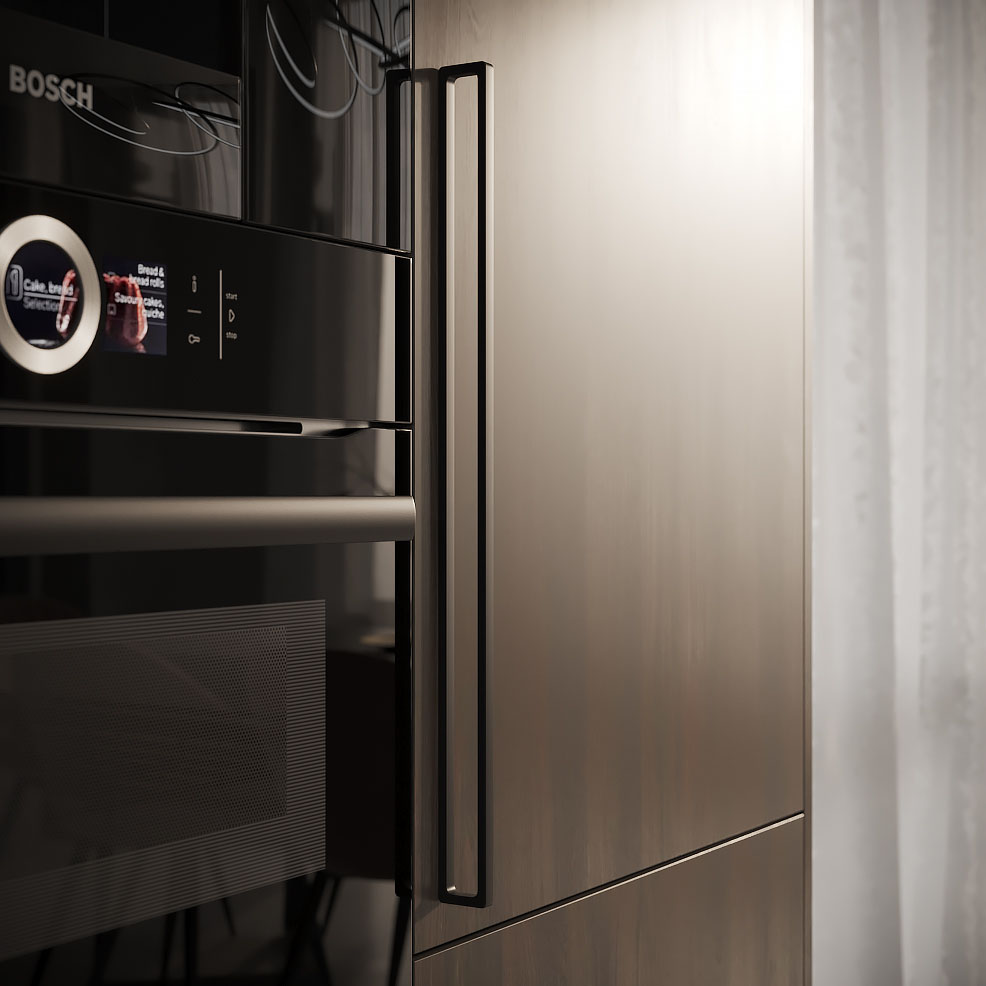 • Красивая кухня с золотыми акцентами в двухкомнатной квартире бизнес-класса
