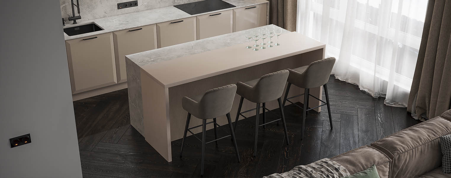 • Красивая кухня с золотыми акцентами в двухкомнатной квартире бизнес-класса