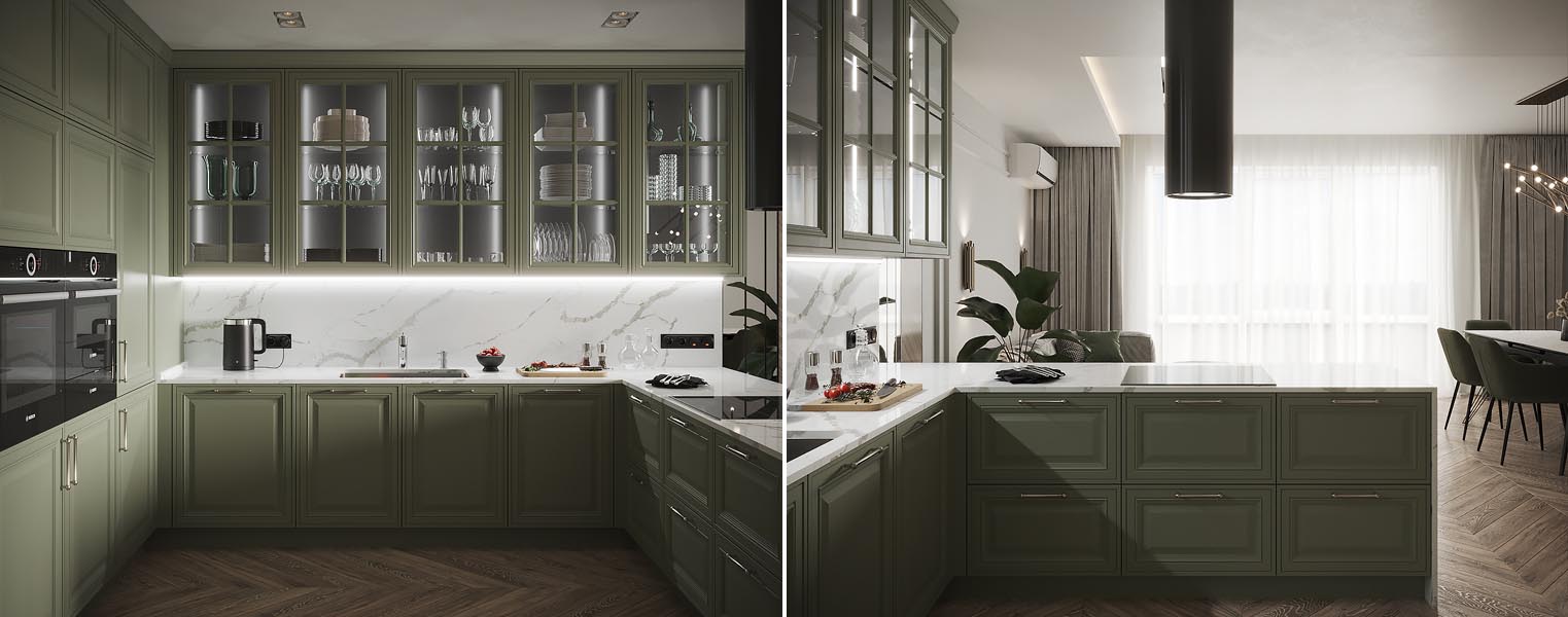 Красивая кухня с золотыми акцентами в двухкомнатной квартире бизнес-класса